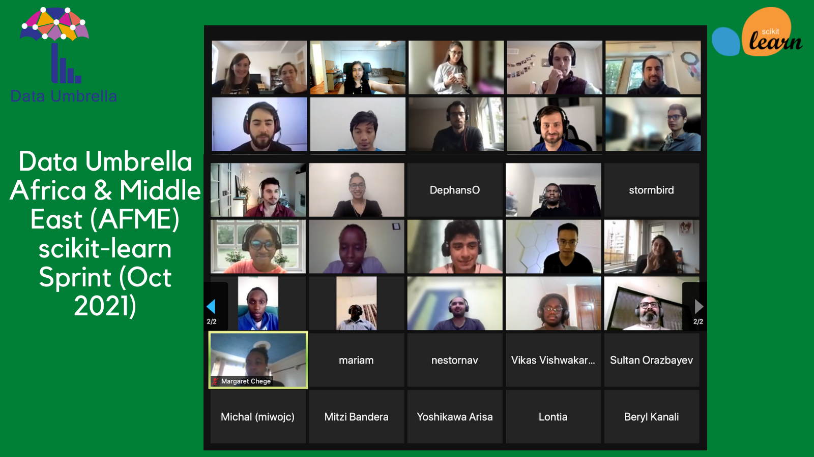 The Data Umbrella Africa & Middle East (AFME2) scikit-learn online sprint was held on October 23, 2021, and the event report is now available. 40 participants joined from 17 countries, and 57% were returning contributors.