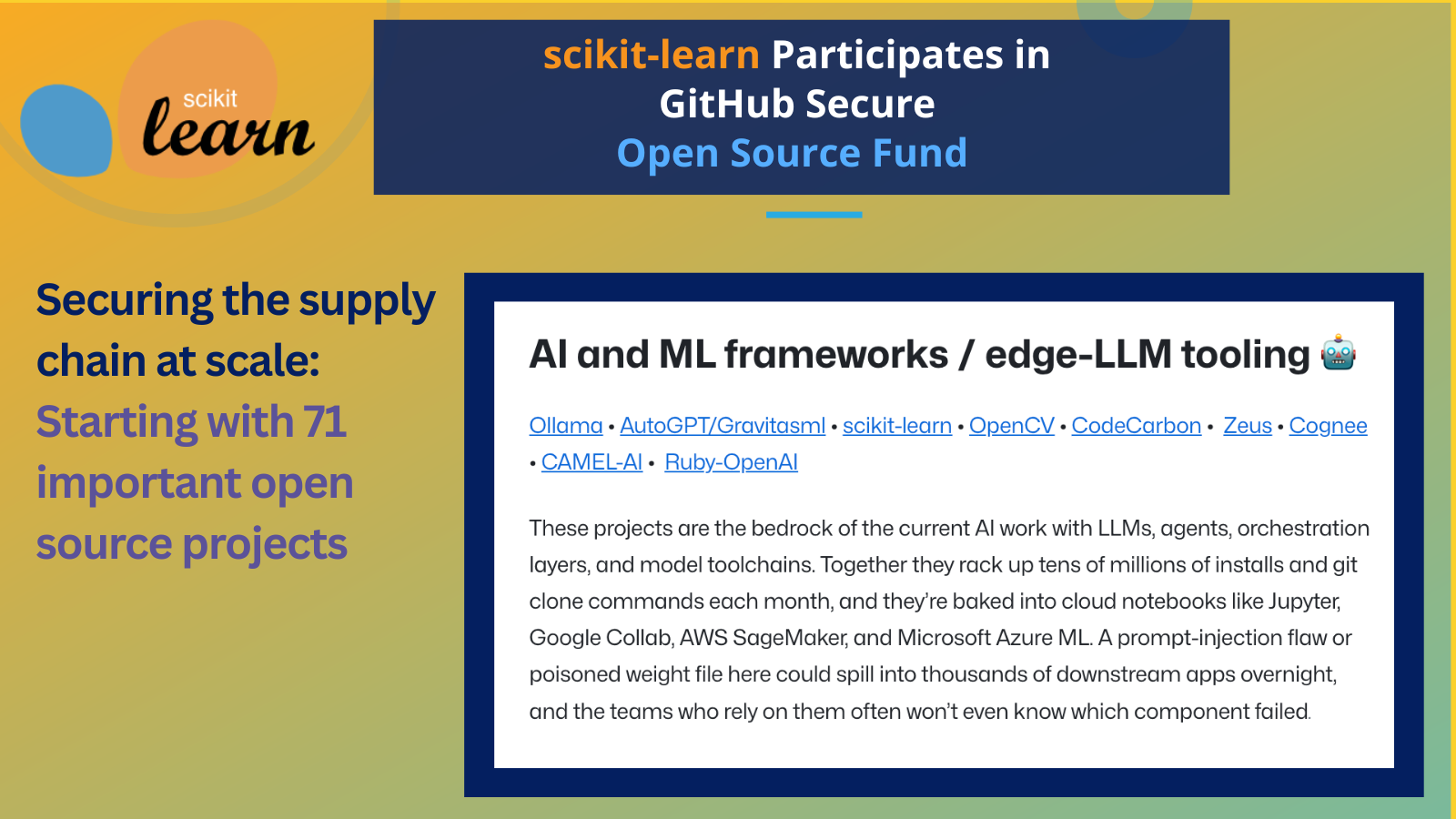 scikit-learn was honored to be selected to participate in Cohort 2 of the GitHub Secure Open Source Fund (OSF) Training Program. Cohort 1 took place earlier in 2025 with 19 projects, and Cohort 2 took place with 52 projects during June 2025.